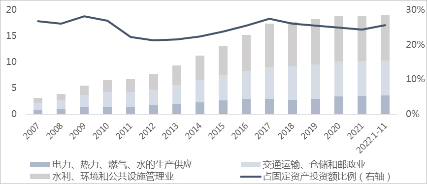 根據(jù)WIND數(shù)據(jù),廣義基建投資2021年達(dá)到18.9萬億元,占全社會(huì)固定資產(chǎn)投資額的24%,具體分為三大類行業(yè),一是交通運(yùn)輸、倉(cāng)儲(chǔ)和郵政業(yè),占2021年基建投資的36%,主要有道路運(yùn)輸業(yè)(包括城市軌交,不含市政道路)、鐵路運(yùn)輸業(yè)、倉(cāng)儲(chǔ)業(yè)等;二是水利、環(huán)境和公共設(shè)施管理業(yè),占2021年基建投資的46%,主要有公共設(shè)施管理業(yè)(包括城市道路、排水、橋梁、廣場(chǎng)、公園等市政工程和城市公共設(shè)施)、水利管理業(yè)、生態(tài)保護(hù)和環(huán)境治理業(yè)等;三是電力、熱力、燃?xì)饧八纳a(chǎn)和供應(yīng)業(yè),占2021年基建投資的18%。
