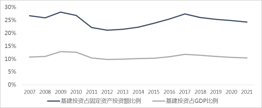 圖2:我國(guó)基建投資占固定資產(chǎn)投資、GDP比例測(cè)算