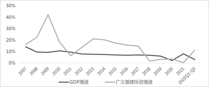 其次,基建投資是我國(guó)實(shí)施宏觀調(diào)控的重要抓手。基建投資可控性強(qiáng),可在預(yù)期時(shí)間內(nèi)促進(jìn)經(jīng)濟(jì)企穩(wěn)、穩(wěn)定民生就業(yè)、改善市場(chǎng)預(yù)期,是良好的逆周期政策調(diào)節(jié)工具。千禧年以來的經(jīng)濟(jì)下行期中,基建投資均起到了熨平周期、穩(wěn)定增長(zhǎng)的作用。第一次是2008-2009年,面對(duì)全球金融危機(jī),我國(guó)推出“四萬億”等財(cái)政政策,基建投資同比增速大幅提高至23%、42%,占2009年GDP比例達(dá)12.8%,強(qiáng)勢(shì)托底經(jīng)濟(jì);第二次是2012-2013年,面對(duì)歐債危機(jī)等外生沖擊,基建投資增速在2013年大幅回升至21%,疊加制造業(yè)、房地產(chǎn)一同刺激經(jīng)濟(jì)復(fù)蘇;第三次是2016年,面對(duì)經(jīng)濟(jì)下行,基建投資在相對(duì)寬松的政策環(huán)境下維持高位,以15.71%的增速穩(wěn)住經(jīng)濟(jì)大盤;第四次是2022年前三季度,我國(guó)經(jīng)濟(jì)增速受疫情沖擊下滑至3%,基建投資再度扛起穩(wěn)增長(zhǎng)大旗,同比增速達(dá)到11.2%,有力帶動(dòng)經(jīng)濟(jì)回歸正常軌道、確保運(yùn)行在合理區(qū)間。